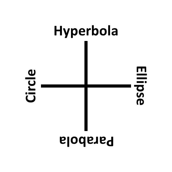 Letting my analogical thinking run rampant, I can think of several associations with other fourfolds presented here. The circle is the shape of perfection, of identity and wholeness. It has one center or focus. In Minkowski Space-time, it is formed by the plane cutting the light cone at a constant time, so that all light arrives at the observer simultaneously from the past. Thus it is the shape of the knower or perspective. The parabola has the shape of gravity, the arc of an object thrown from and falling towards the earth. The shape reminds me of a reality that flies up from the opaque depths of the knowable only to fall away again. Numbers that are perfect squares may have started ancient mathematicians thinking about arithmetic. The ellipse has the shape of cosmology. Once astronomers could consider orbits of planets not to be circles or epicycles, only then science changed from idealism to empiricism. The hyperbola’s asymptotes form the crossed lines of my ever-present double duals, dividing yet unifying, as well as the profile of Minkowski Space-time. In fact, space and time occur over and over in many of the fourfolds I have considered.