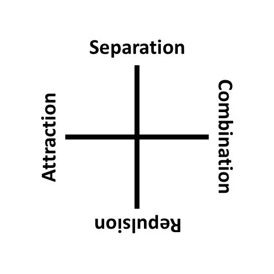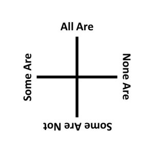 In the diagram I have removed the S and P, and the logical forms become spare and like a Zen Koan or nursery rhyme: Some Are, Some Are Not, All Are, and None Are (or All Are Not). By doing so, they resonate more brightly with the other fourfolds and how they are presented herein. Now, the logical forms can be about existence, or the subject and predicate withdraw and become implicit to the thought.