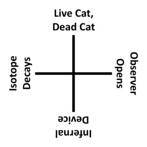 There seems to me a similarity between Maxwell’s Demon and Schrödinger’s Cat. The fourfold elements of the experiment are shown above, but now consider these elements in a system in terms of Aristotles’s Four Causes. The material causes are the discreet constituents of the experiment, everything from box to atoms to cat to observer. The efficient cause is the decay or non-decay of a radioactive atom. The final cause is action of the observer in opening the box. The formal cause is the poor cat in its ambiguous state, simultaneously both dead or alive.