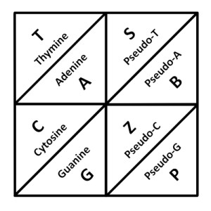 Now scientists have doubled the number of base pairs of DNA by adding four synthetic ones to the original four natural ones. Four new base molecules S (a Pseudo-T), B (a Pseudo-B), Z (a Pseudo-C), and P (a Pseudo-G) have been created so that S only pairs with B and Z pairs only with P. Now you have twice as many options as you had before and so this “hachimoji” (eight letter) DNA can have much greater information density. Plus if you re-engineer the molecular machinery to use these new bases you can have a brand new extended genetic code to build all sorts of synthetic proteins.