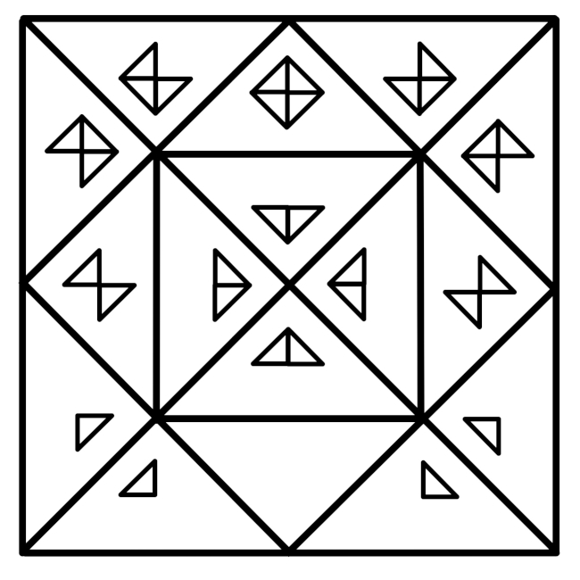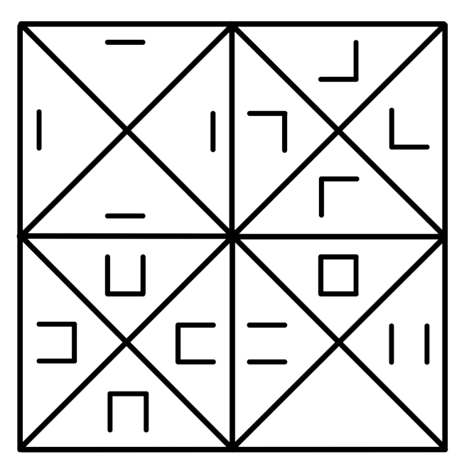 (Please note that the characters of the LICO alphabet are oriented so that the bottoms of the letters are downward, but the Boolean operators are oriented so that the bottoms of the equations are towards the right angles of the triangles.)