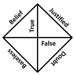 Here I show a diagram for those three conditions (Justified, True, Belief) and their opposites (Baseless, False, Doubt). The Wikipedia page on the Gettier problem states simply that the solution for it is that the justification must be true also, as the belief.