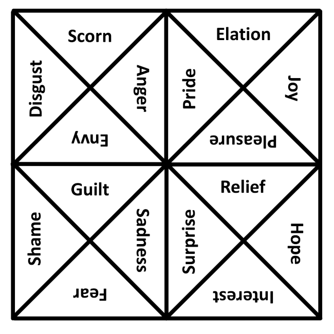 (Circular Order) Anger, Contempt, Disgust, Envy, Guilt, Shame, Fear, Sadness, Surprise, Interest, Hope, Relief, Satisfaction, Joy, Elation, Pride