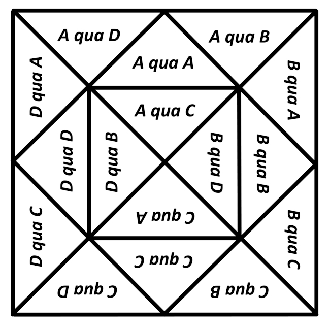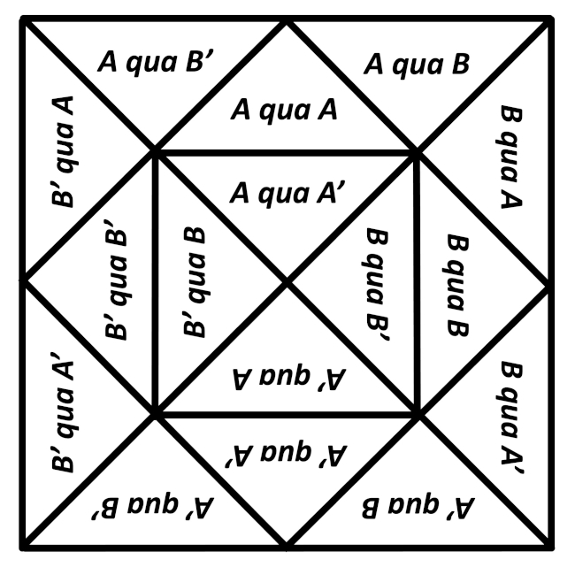 Here is a diagram for a set of four things standing in for each other, as in their being, character, function, or capacity. Qua is a proper English word (from Latin) meaning “as” or “as being” but also “in the function of” or “in the capacity of”. Often used as “A qua A” rather than “A qua B”.