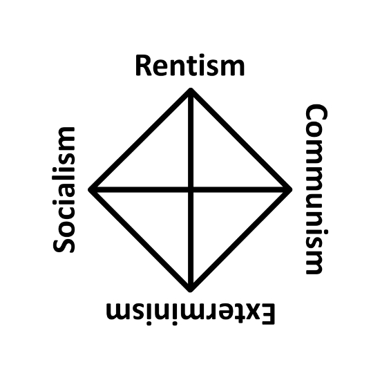 The cover has a nice iconography for the futures: a conveyor belt on a 3D printer assembly line shows a glass of wine for Communism (Cheers!), a key hole for Rentism, a watering can for Socialism, and a skull for Exterminism (Ouch!).