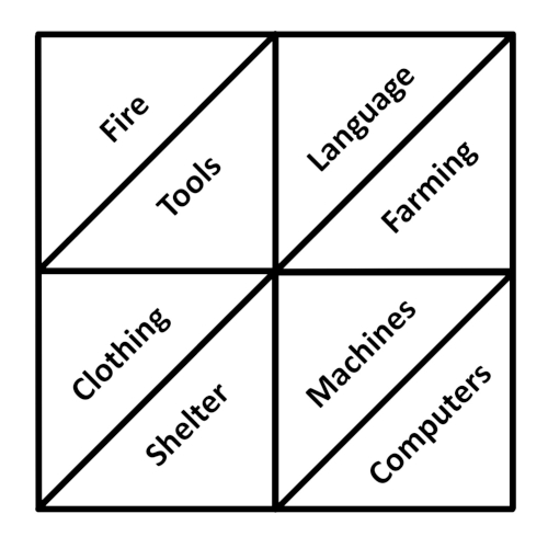 Instead of having two technologies, “Clothing” and “Shelter,” Currier combines them, and lists “technologies of interaction” which includes writing, water-craft, the wheel, etc.