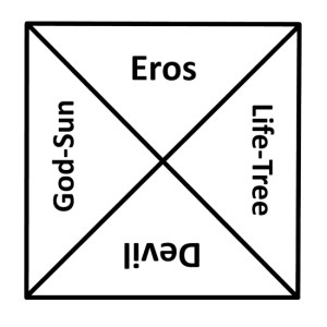 Jung’s diagram of his alchemical tetrameria is supposed to represent the evolving self, and suggests movement, succession, and change and yet stillness, consistency, and renewal. His own diagram is quite different from mine, but I do think that mine has some merit.