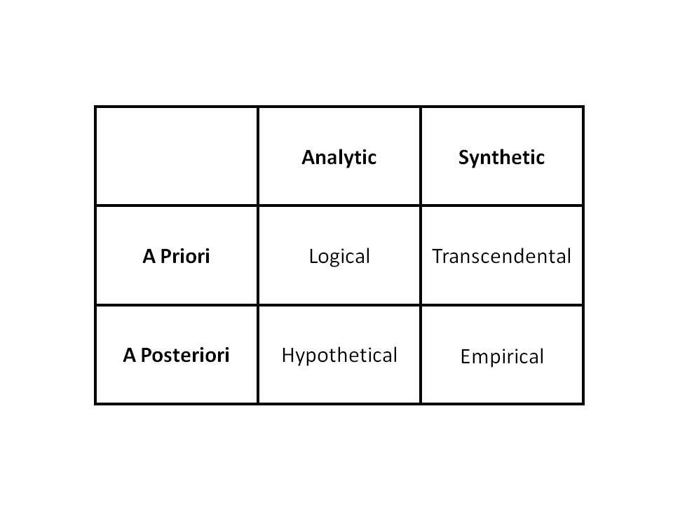 In addition, if you search for the two pairs a priori-a posterior and analytic-synthetic, you also find that the pair necessary-contingent is associated with them. Are these three pairs independent of one another and so give rise to eight triplets, or are they dependent in some way and reduce into fewer combinations? In addition, from Wikipedia: